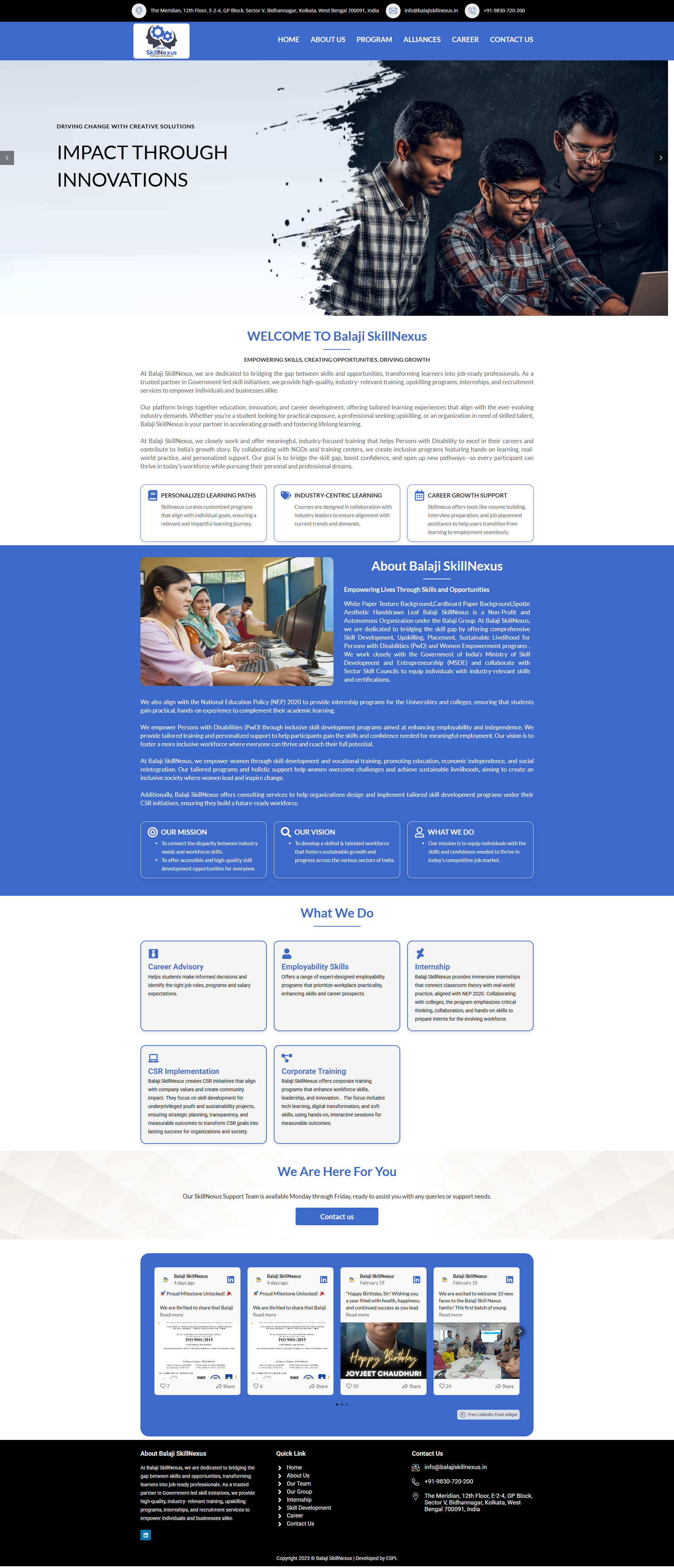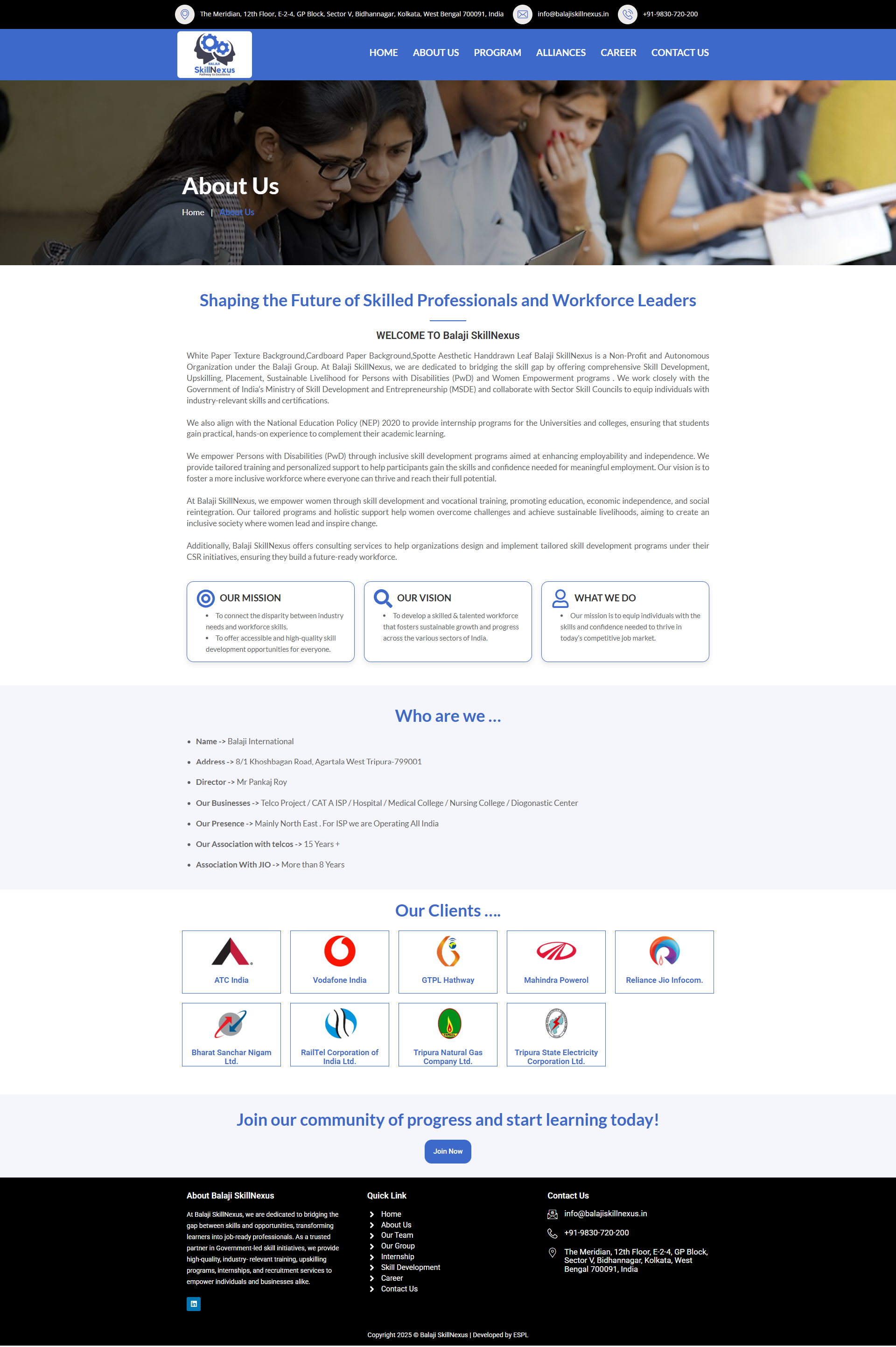 At Balaji SkillNexus, we are dedicated to bridging the gap between skills and opportunities, transforming learners into job-ready professionals. As a trusted partner in Government-led skill initiatives, we provide high-quality, industry- relevant training, upskilling programs, internships, and recruitment services to empower individuals and businesses alike.