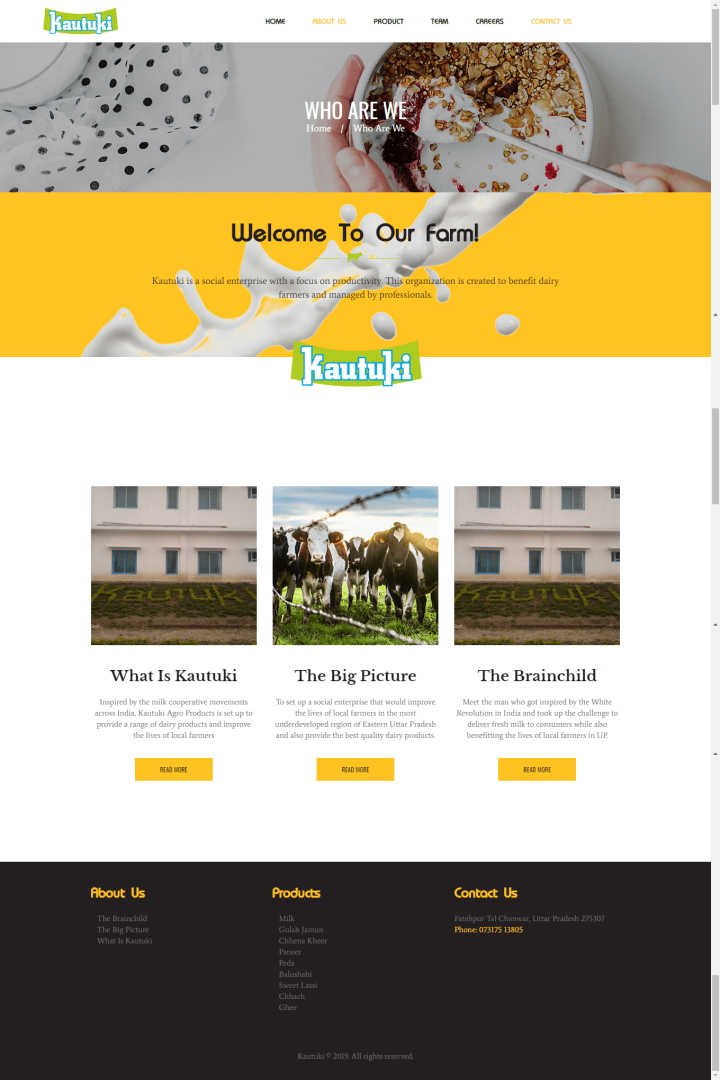Kautuki is a social enterprise with a focus on productivity. This organization is created to benefit dairy farmers and managed by professionals. kautuki.com YEAR 2019 WE DID Website Development CATEGORY Wordpress COUNTRY India INDUSTRY Dairy Products Prev. Project All Projects Next Project