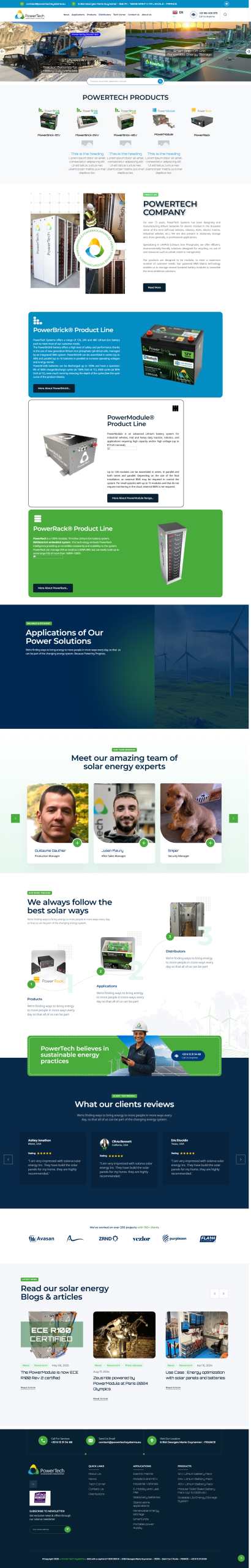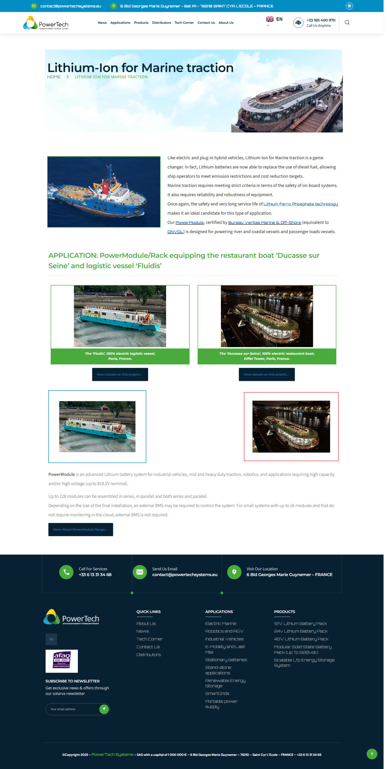 PowerTech Systems is a French company founded in 2013 and located in Saint Cyr L’Ecole, France. We specialize in the design, manufacture and marketing of high performance Lithium batteries (> 1KW) covering a large application spectrum (vehicle traction, stationary storage, Off-Grid, etc..).